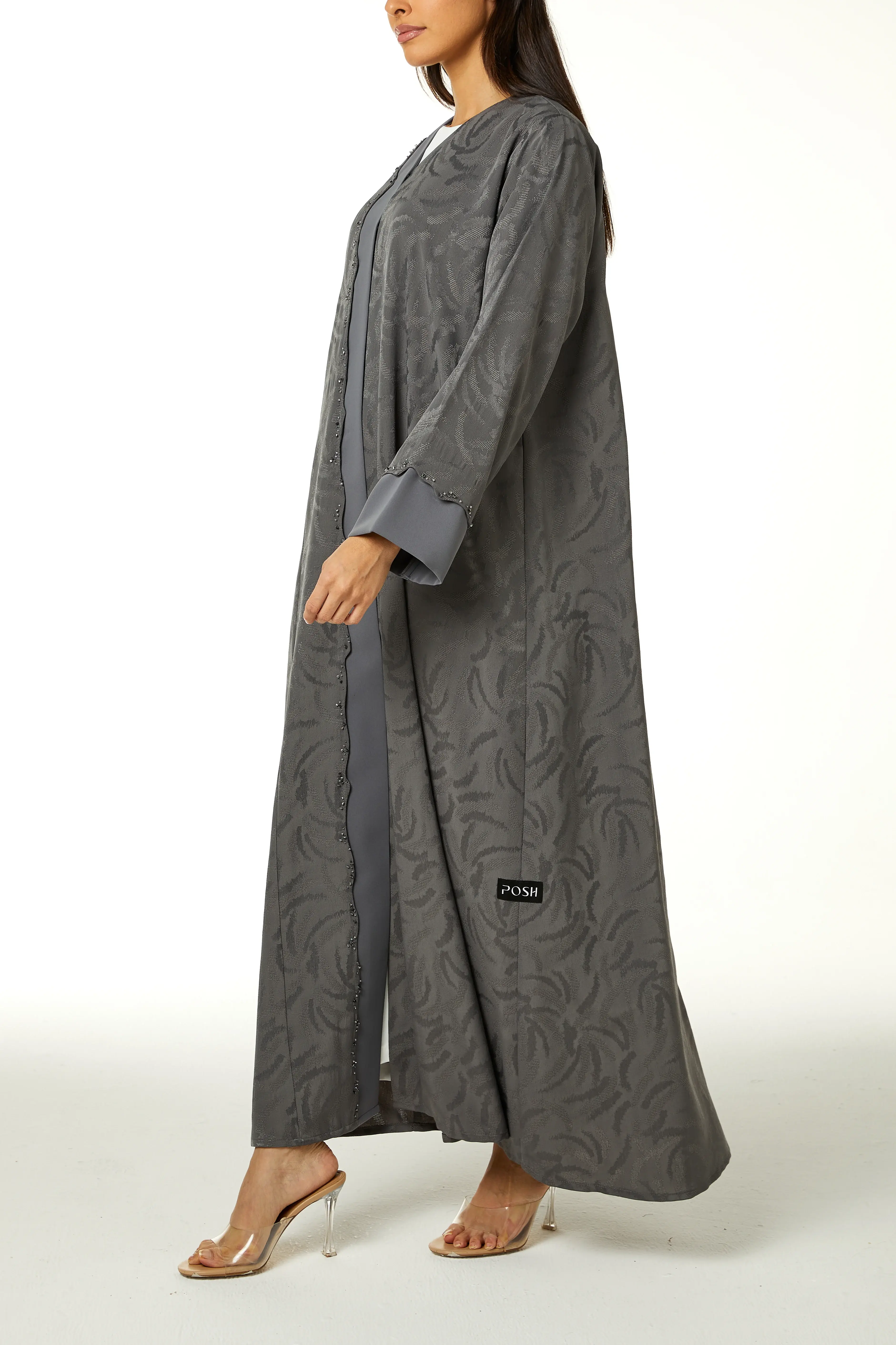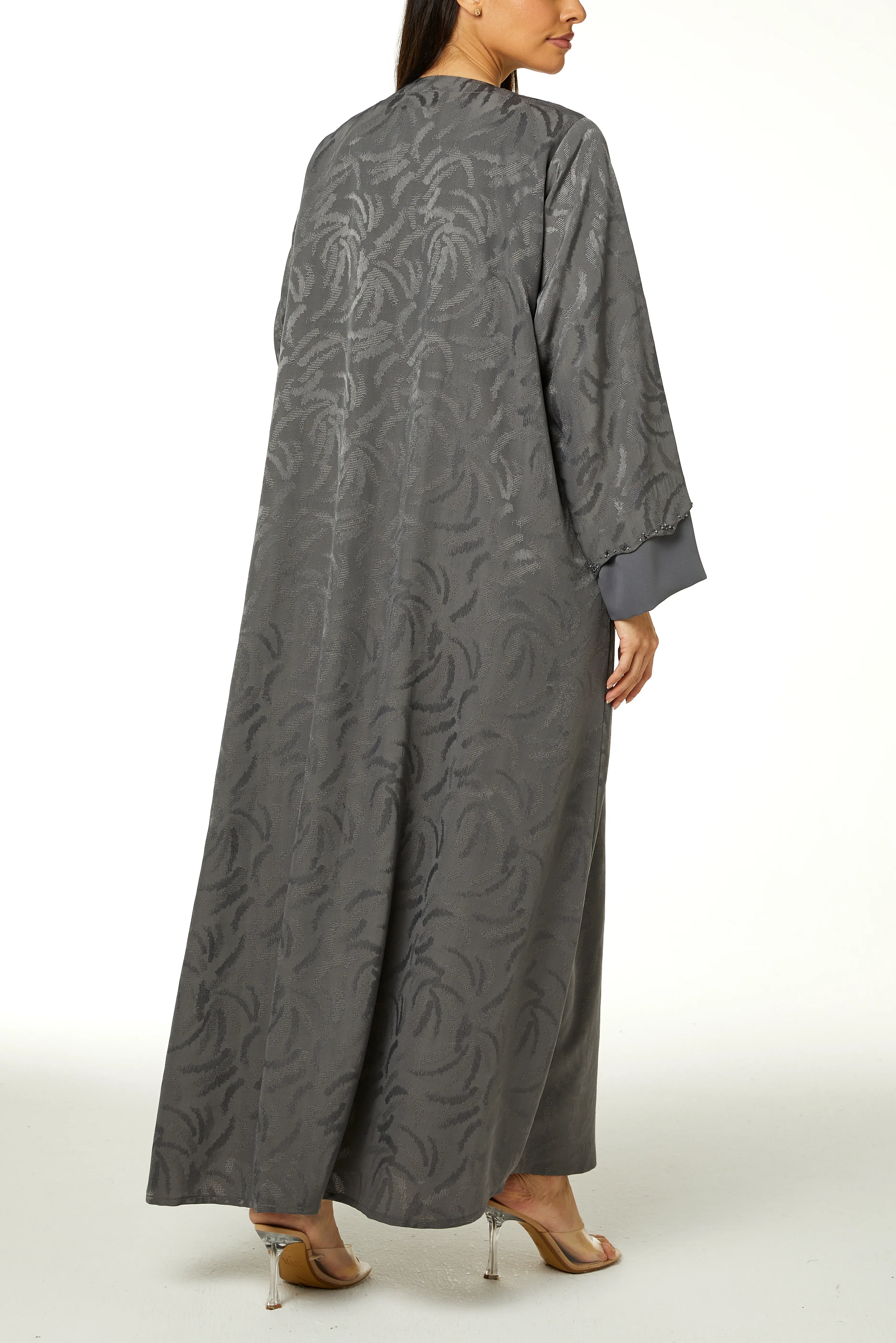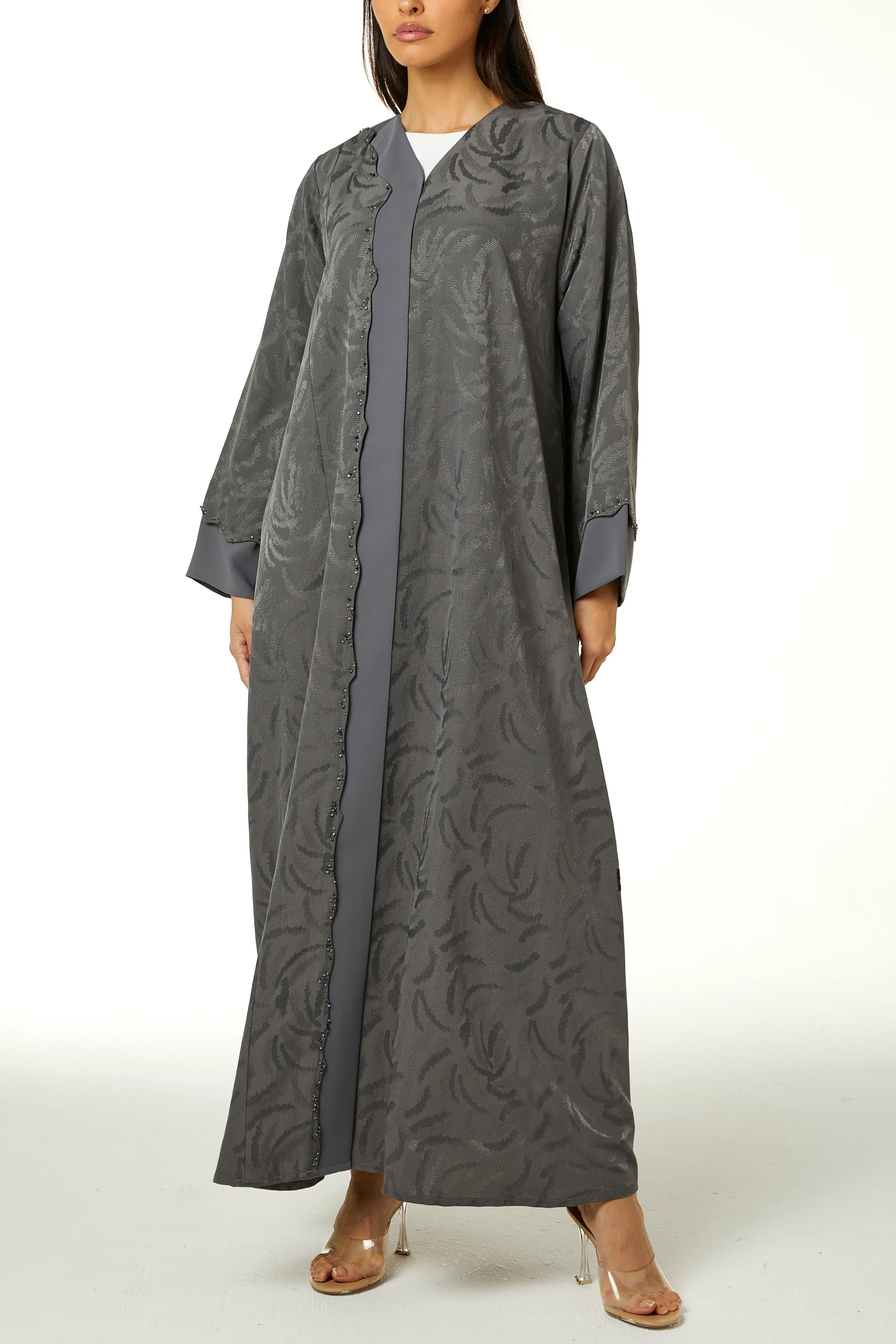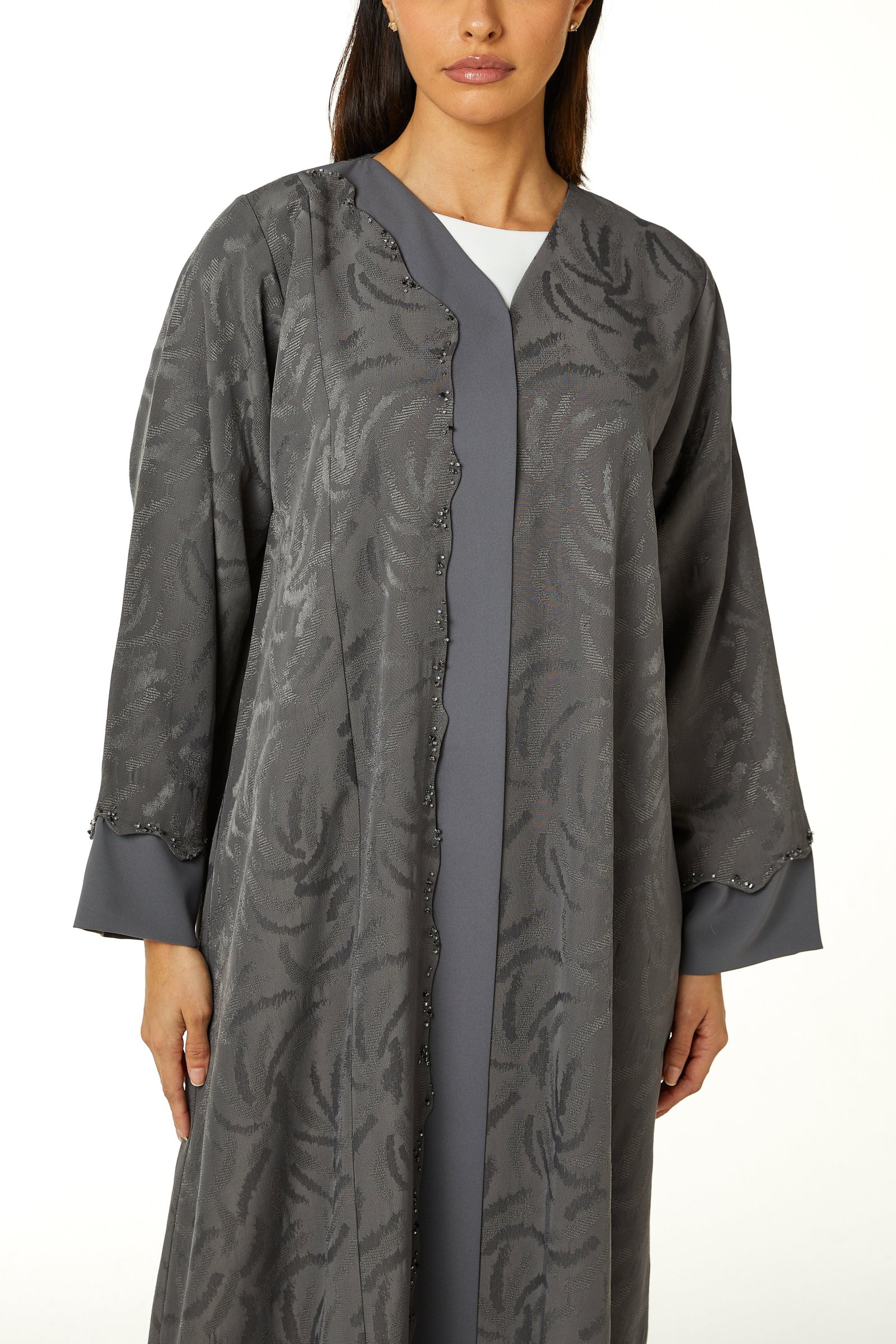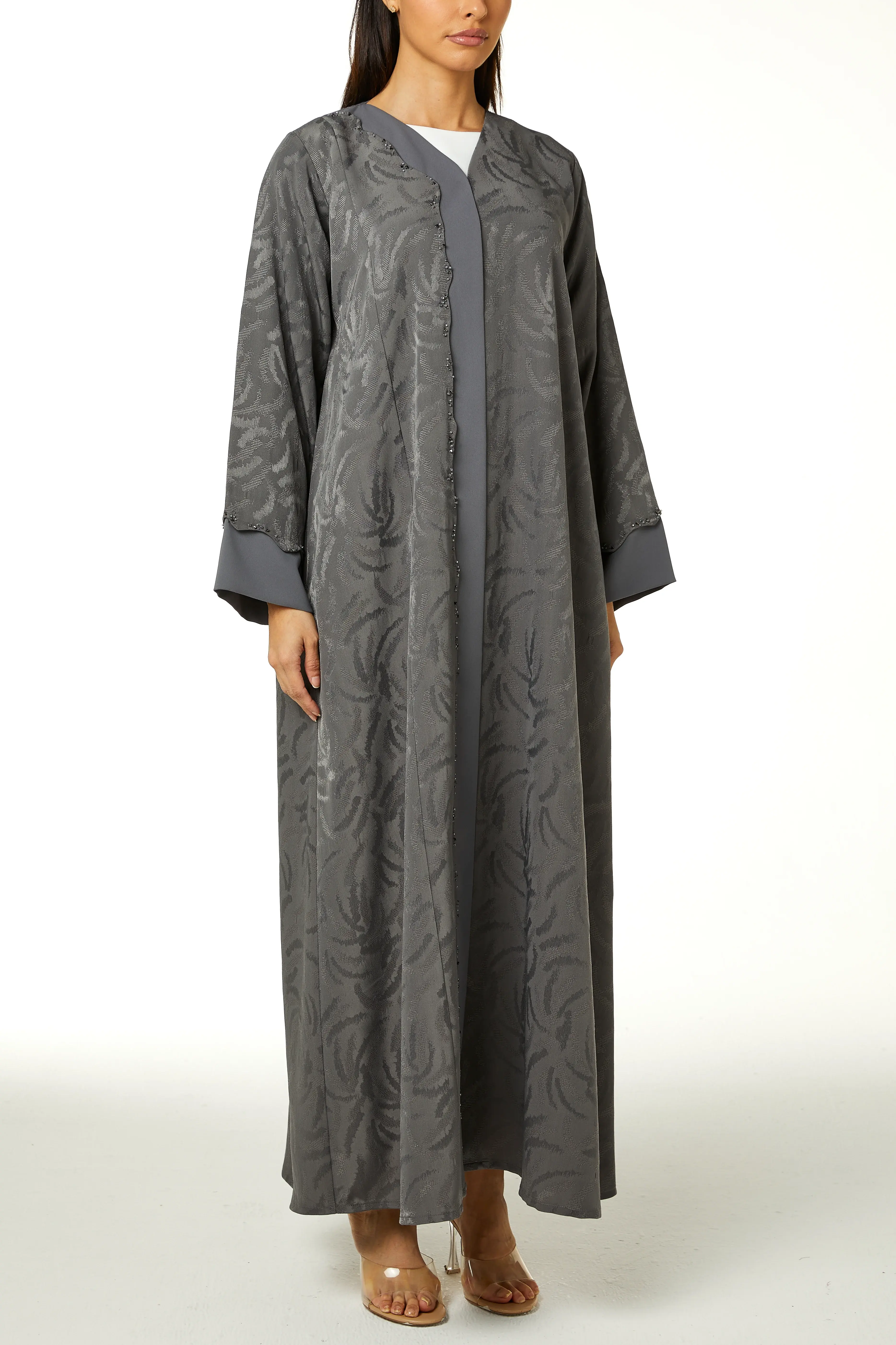 عباءة ألفا الرمادية من قماش الجاكارد الفاخر، تتألق بتطريز خرز دقيق على مقدمة القطعة.